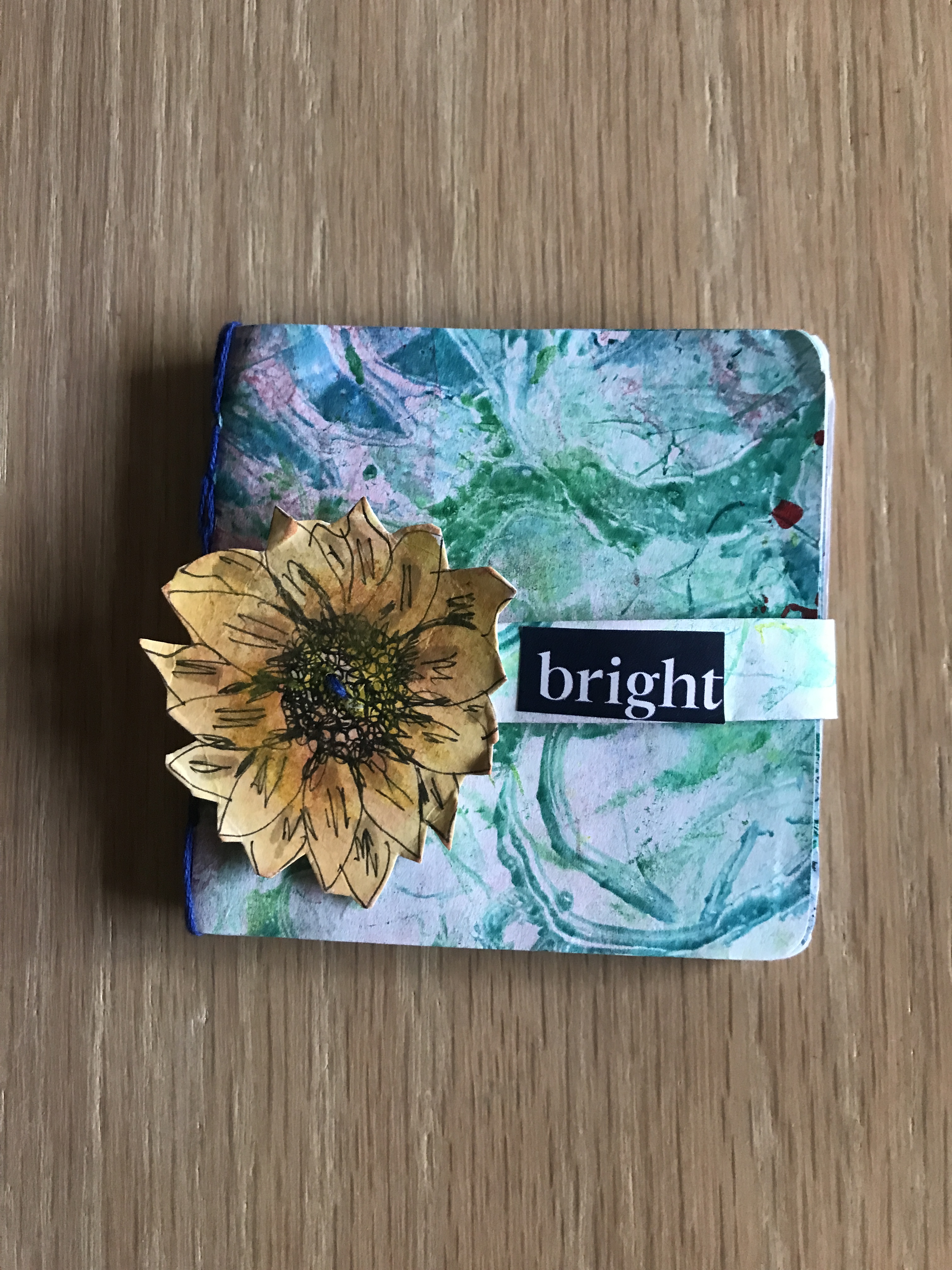 Today I made a mini book with chain-stitched spine using the colorful prints, some embroidery floss, a random sunflower I had once doodled.