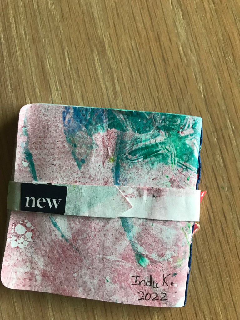 I joined an online four-day bookmaking challenge. I love paper and have several beautiful selections. However, I like to create my own art. For this, I collected all ugly gel print scraps, ripped the nice parts, dug into my recycling bin, got some used teabags, lace, scrap fabric, words from magazines, color copies of experimental doodles, tissue, watercolor, and copier papers. I collaged it at all to 300 GSM watercolor paper. Amidst this chaos, I brought out metallic watercolor paint and left over coffee to drink, splatter, splotch, and spill with intention.
