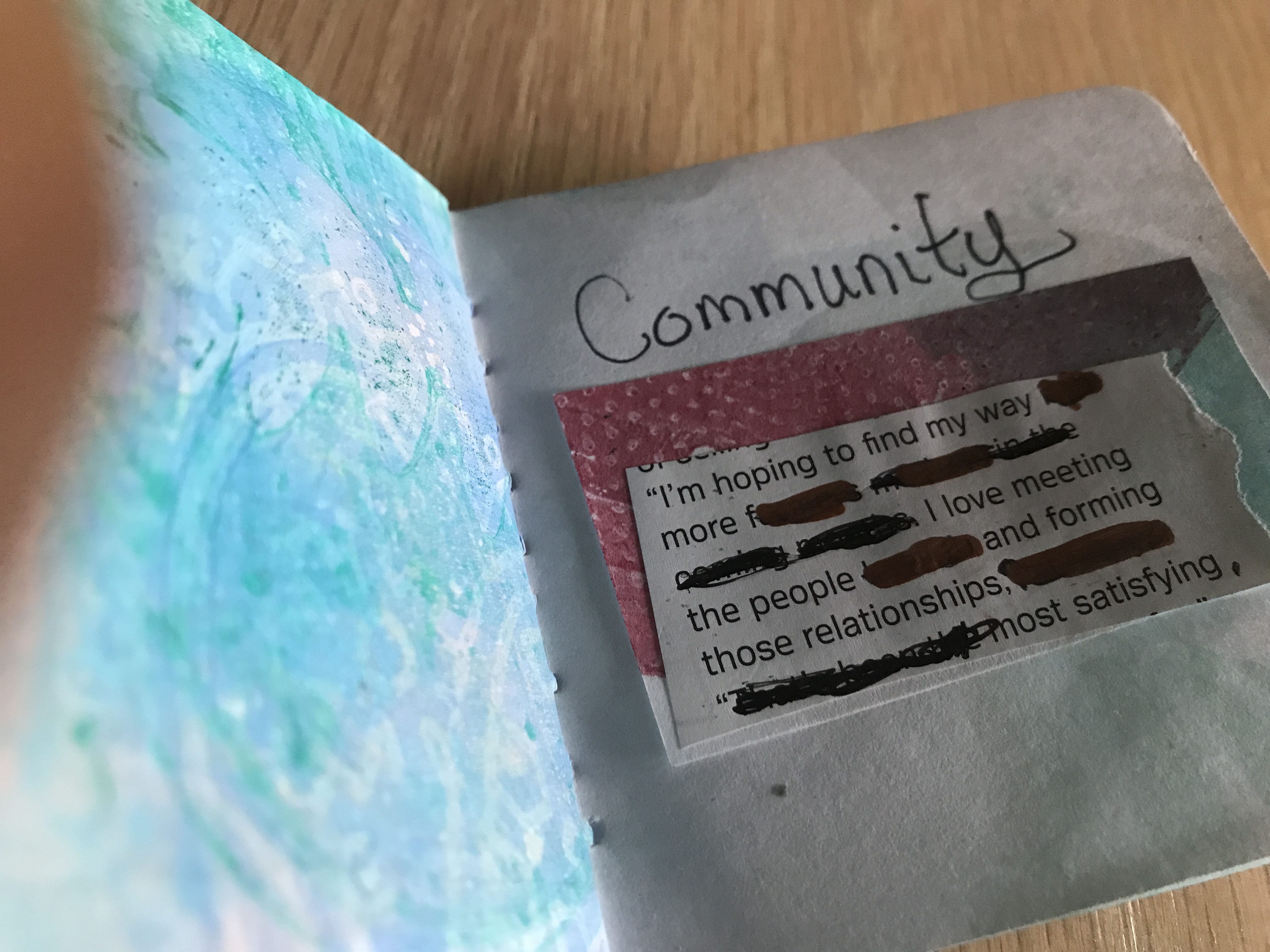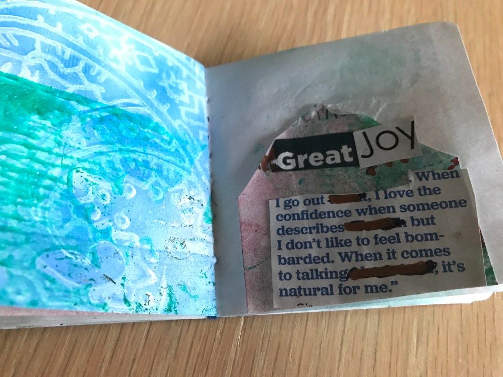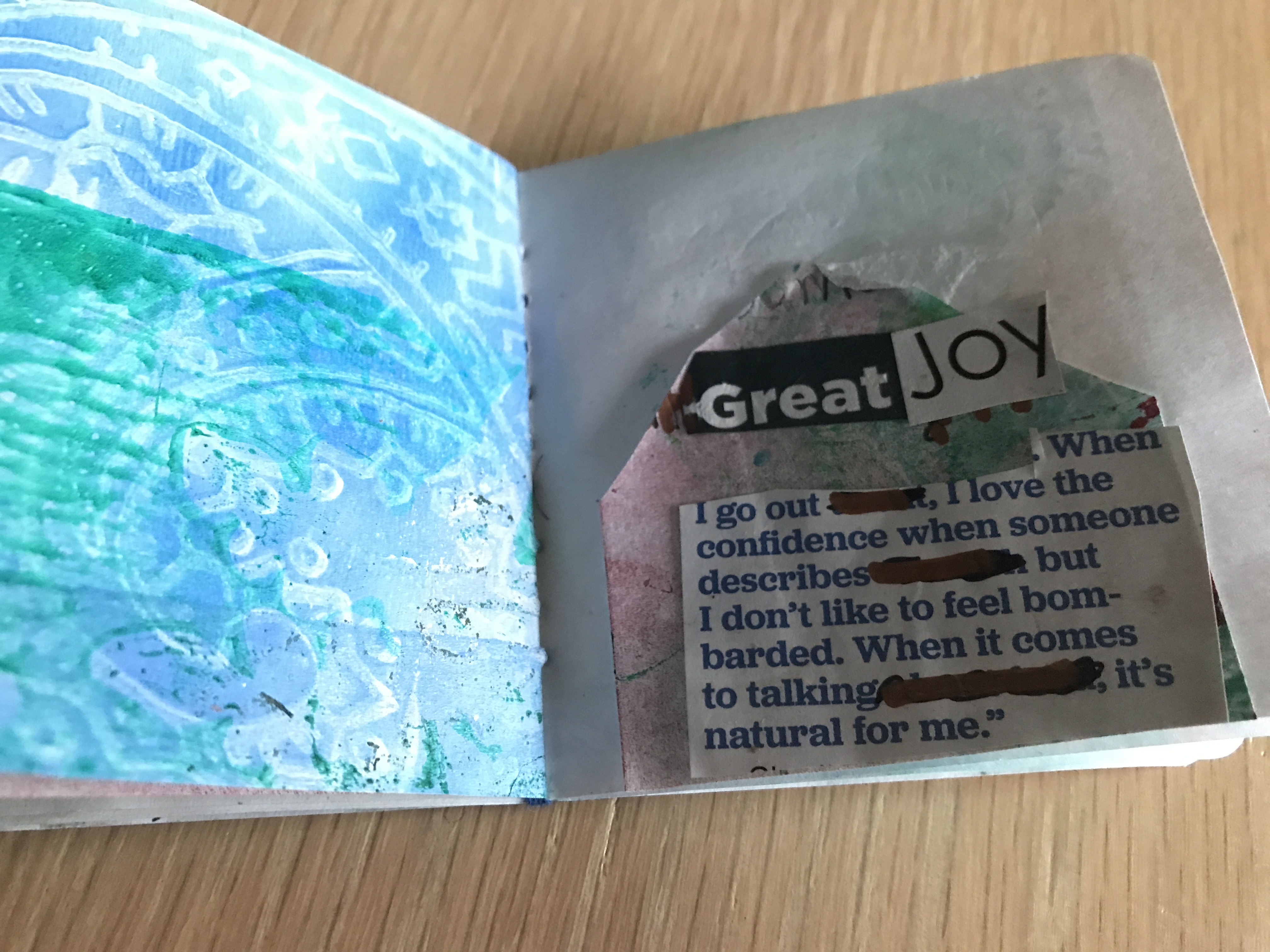 The pages were colorful, but they lacked words. I wanted to exorcize my block by selectively blocking someone else’s words. I culled out paragraphs and quotes from PUNCH magazine to do this.The altered meaning inspired a play with poetry.