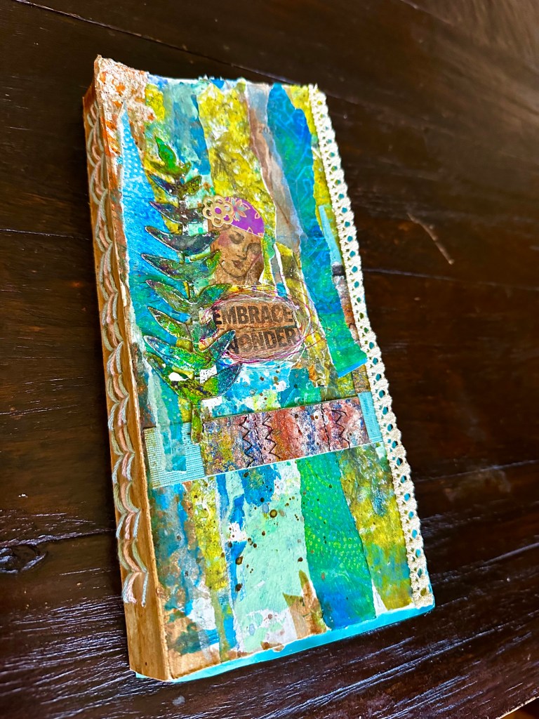 The piece reminded me of a mountain. My hand-sewn book lay nearby. Then, I chanced on an old watercolor pan. It revived memories of my now grown children. Memories, green as the trees I was about to paint ushered in childhood long gone.