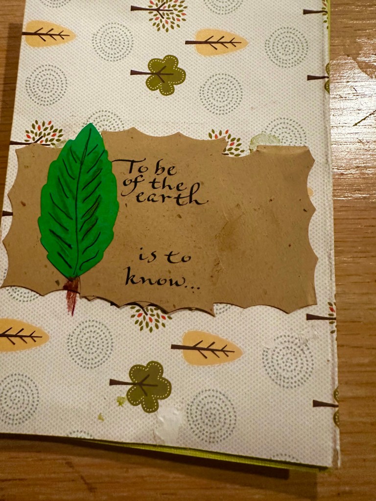 I like to create a bit of something everyday. I saw this structure in a demo by a book artist. My rotating book has tuck pockets and hidden spaces. Its cover, wrapped in patterned paper of trees and greenery, asked for something more. I confess I’m a” paperholic.” I pulled out a scrap with a random part quote. It said, “To be of the earth is to know…” It gave some resolution about seeds, growth, and life cycle. I was not impressed, but the part sentence held much promise.