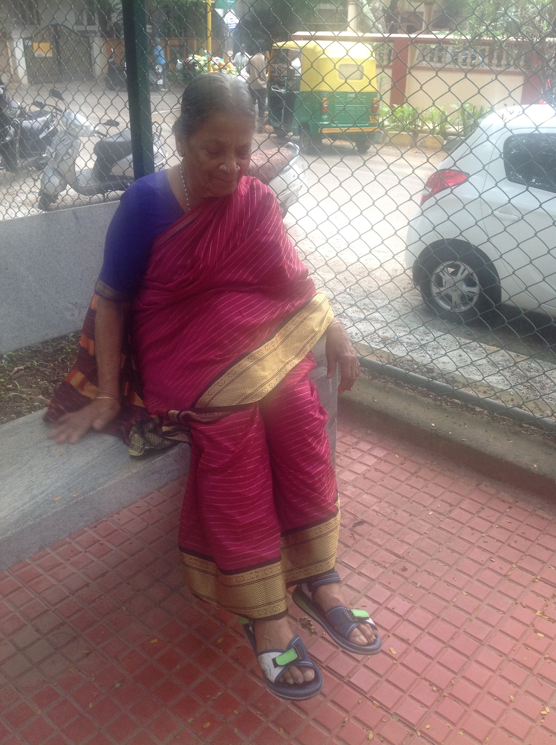 I walk briskly in the neat park, never knowing who I will bump into. Today I meet an older lady, Mrs. Parvathi.