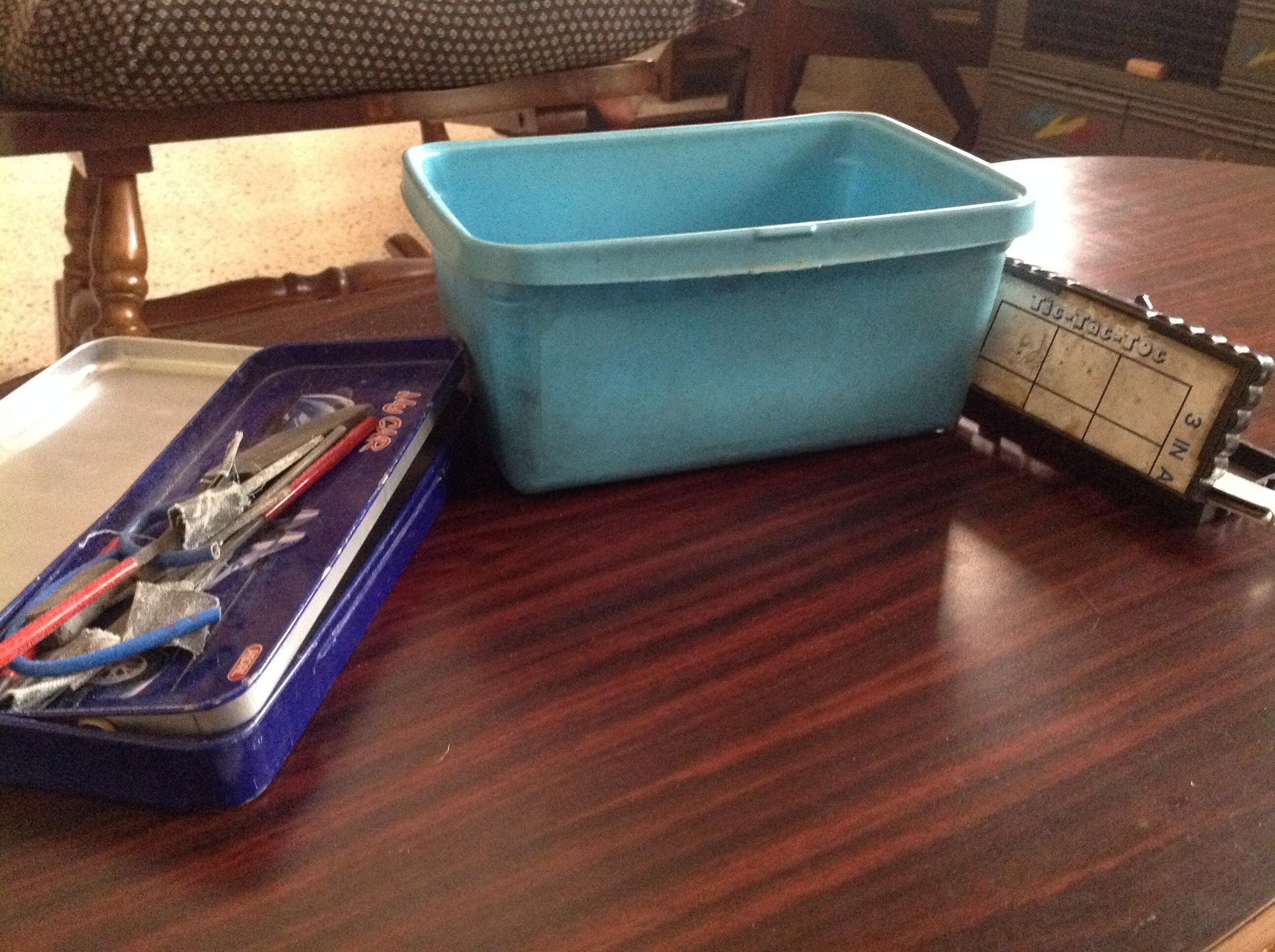 Recently, I saw the once-familiar empty plastic baby wipes box in his garage. He has stored odd screws and hardware in it. It gave me an anachronistic jolt to see something after 24 years!! An old tic-tac-toe game box with contents long gone, houses a feeler gauge. A grandchild’s empty geometry box and my much-dented metal school box serve as toolboxes.