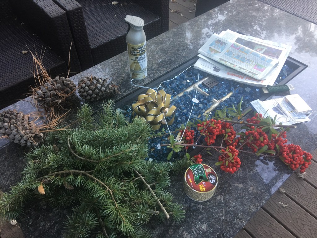 Pine branches, California Holly (Toyon berries), pine cones, used gift-wrapping bows, florist wire, disposable wire hanger, metallic paint, gift wrapping ribbons, needle nose pliers, newspaper