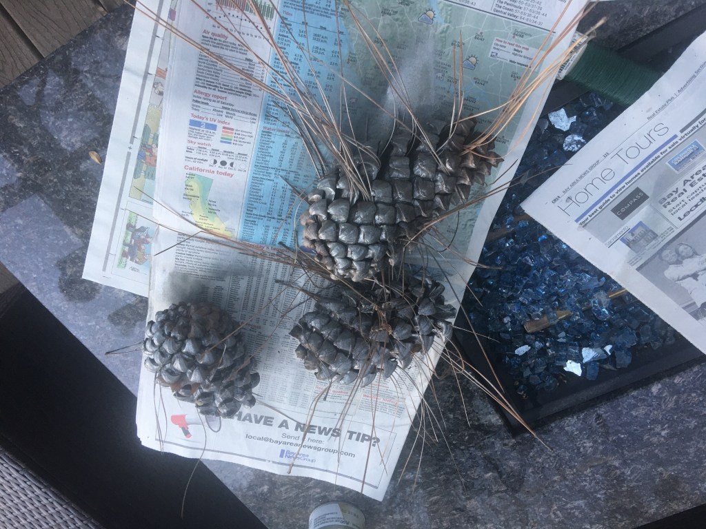 Tuck in the holly, arrange the bows and tie with wire. Add a long ribbon with a flourish. If you want to do more, spray paint pine cones with metallic paint and glue it down using a hot glue gun. I decided to use the pine cones for something else.