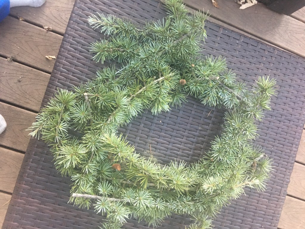Reshape the hanger into a circle. Arrange the pine branches roughly before wrapping with florist wire.