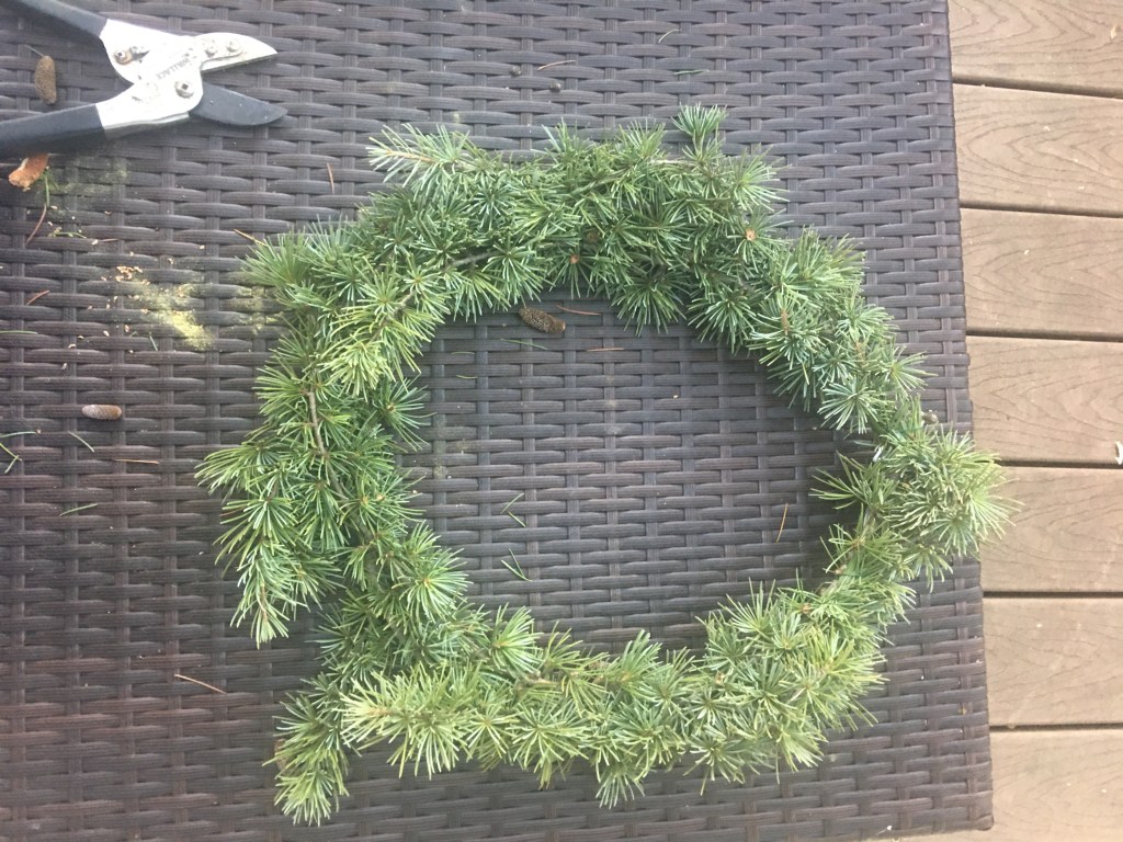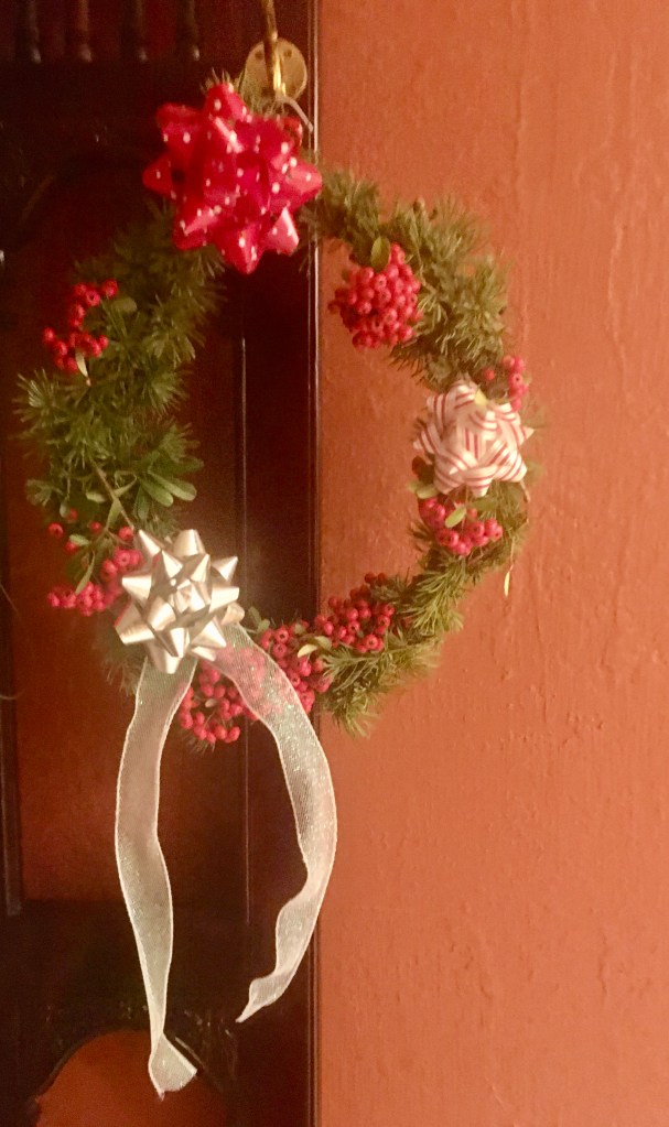 The wreath lasts at least three weeks, spray occasionally with water to refresh. The pine branches are compostable, the wire can be salvaged for another project, so also the bows. Just remember to wear gloves while doing this, it can really save your hands and yes, save the planet while enjoying its treasures.