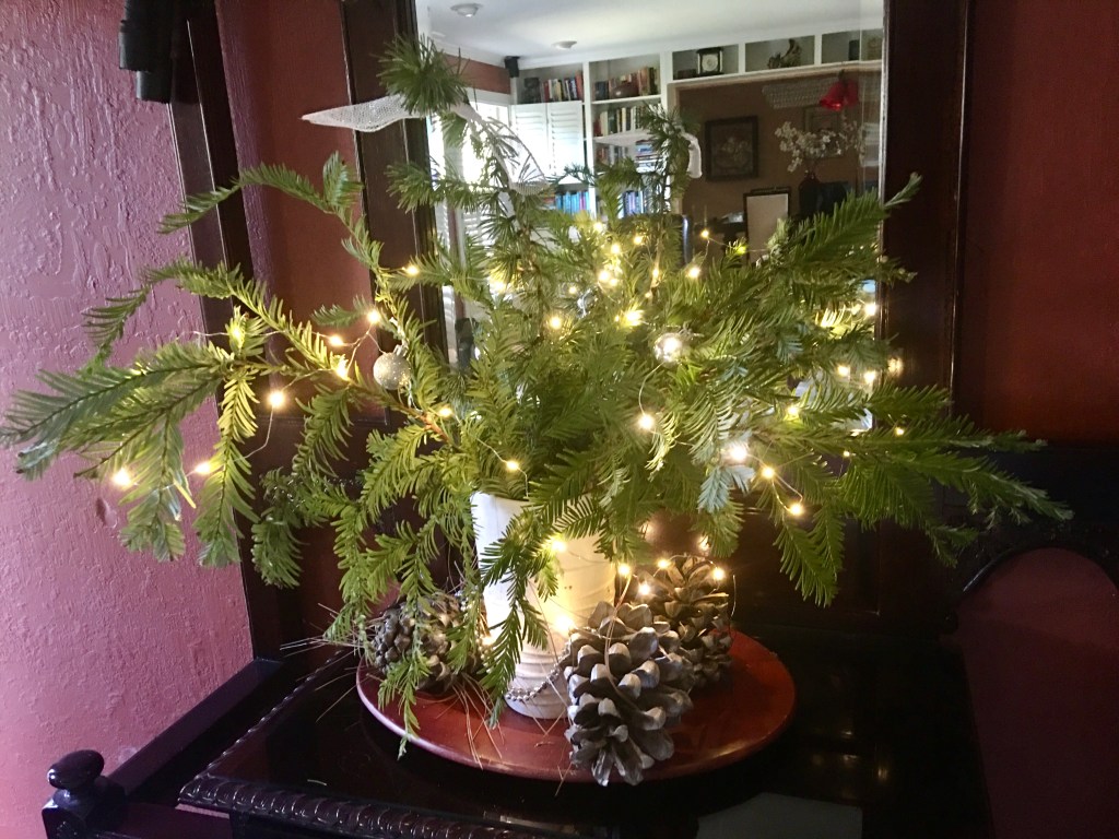 Cull mini pine boughs from different pine trees and stick them into a flower pot. Arrange on a platter with metallic spray painted pine cones. Decorate with mini ornaments, beads, and string lights. Et voilà! You trimmed your outdoor tree and created a mini indoor tree with trim and all.