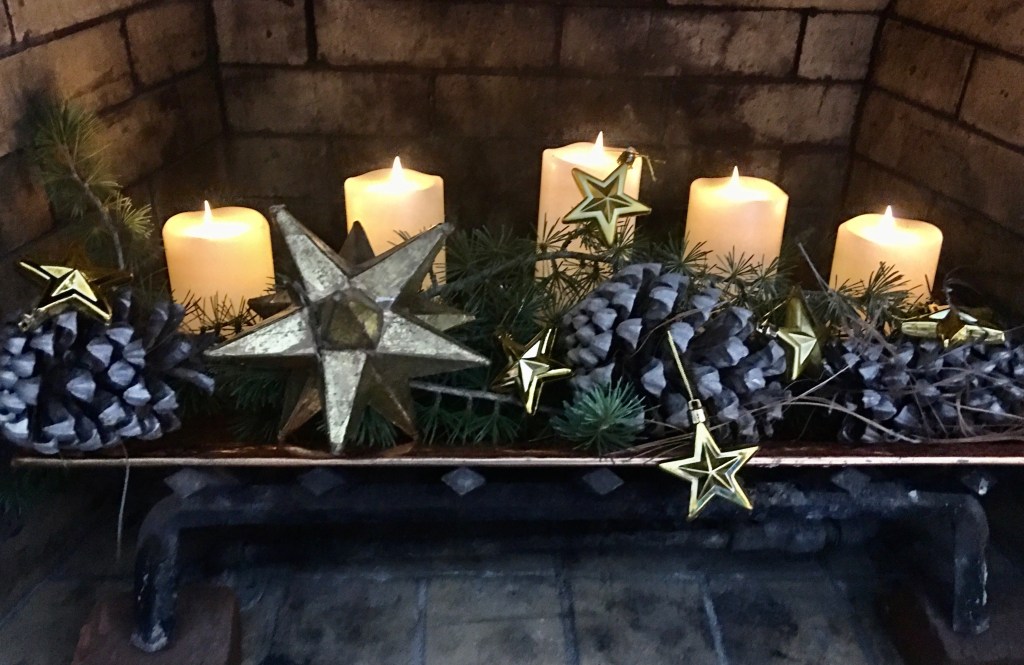 Pine branches , painted or natural pinecones, all those ornaments, a large platter, and 5 LED candles