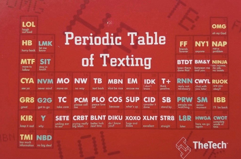One early morning, a friend sent me one chuckle-worthy picture via Whatsapp. It is the periodic table for today’s digital acronyms. I tried with much difficulty to find its provenance to attribute accurate photo courtesy. However, this creative piece has gone viral on several social media platforms without a definite attribution. For those who feast on them and emojis alike, here’s my humble dedication of a text story between two friends. Read the conversation and decode with the table below if you are from an older school.